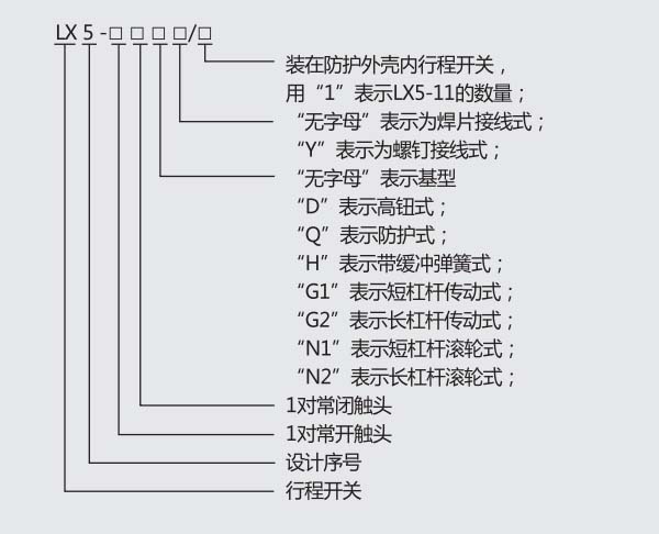 LX5系列行程开关分为接线式,有焊片接线式、螺钉接线式。防护式有开启式、防护式。按钮式有一般式、高钮式。传动式有直动式、杠杆式、滚轮式。
